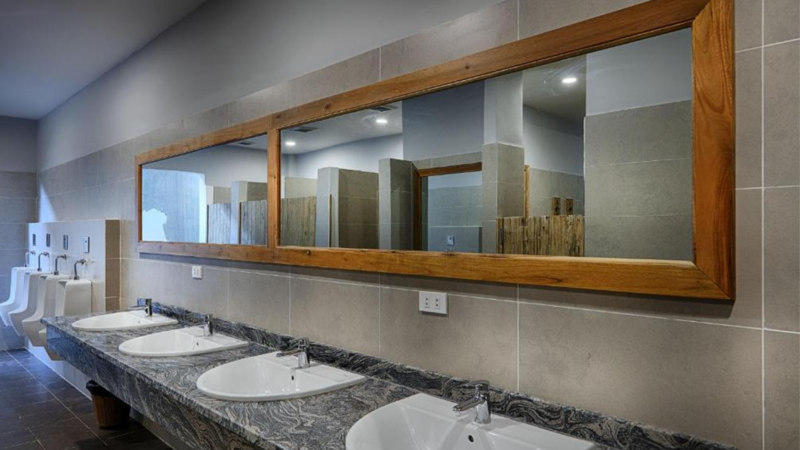 Mang một không gian rộng rãi và thoáng đãng, nhà vệ sinh chung vô cùng sạch sẽ và sáng sủa. Nơi đây được trang bị đầy đủ bồn rửa mặt, gương, nhà vệ sinh, nhà tắm vô cùng tiện nghi và hiện đại.