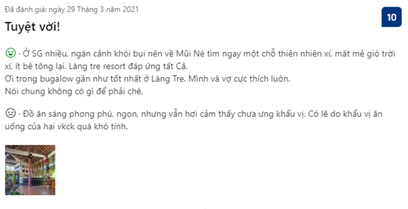 Từ những trang đặt phòng trực tuyến, Reviewvilla.vn đã thu thập được nhiều đánh giá thực tế từ các du khách từng lưu trú tại Bamboo Village Beach Resort & Spa. Hầu như không có ai là không hài lòng với dịch vụ tại khu nghỉ dưỡng 4 sao hàng đầu Mũi Né này. Và 9,4/10 là số điểm mà khách du lịch đã dành cho Bamboo Resort. Sau đây là một vài feedback thực tế: