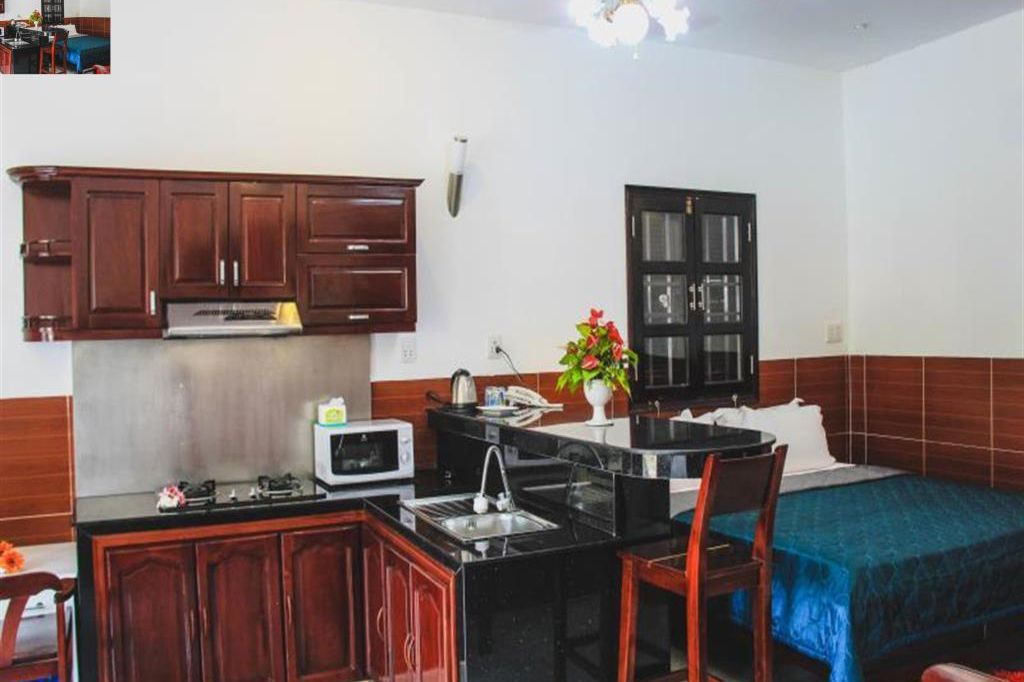Với diện tích rộng rãi nhất trong tất cả các phòng, căn phòng Deluxe Two Queen Size Beds and One Sofa Bed With Sea View được trang bị hai giường Queen size lớn và một chiếc sofa bed có thể gấp gọn thành ghế sofa và trải ra làm giường ngủ. Ngay bên cạnh giường là một khu bếp để du phục vụ nhu cầu nấu ăn của du khách.