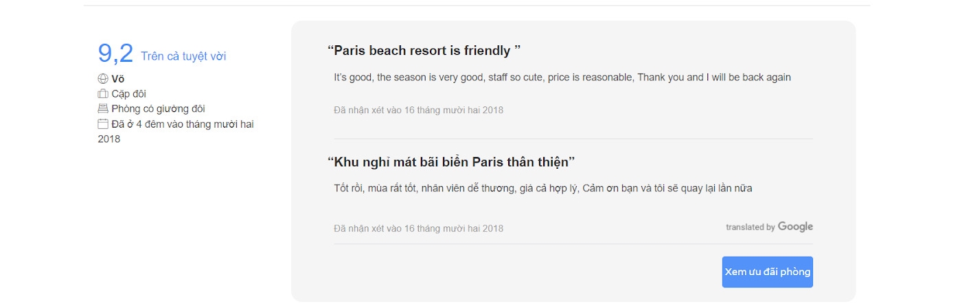 Đây là một số review cũng như feedback của du khách đã trải nghiệm dịch vụ tại Paris Beach Village. Nếu như du khách đang mong muốn tìm kiếm những đánh giá chân thật nhất về resort thì hãy cùng tham khảo những feedback dưới đây nhé!