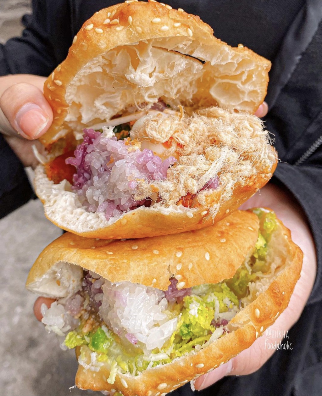 Bánh tiêu dai dai, kẹp giữa là xôi nếp mềm dẻo, không nhão cùng không khô tạo cảm giác vừa miệng thơm ngon. Để tạo thêm vị thơm ngon ngậy ngậy cho bánh nhiều người bán hàng đã thêm những sợi dừa già bào mỏng làm bánh trở nên trọn vị hơn xiết bao.
