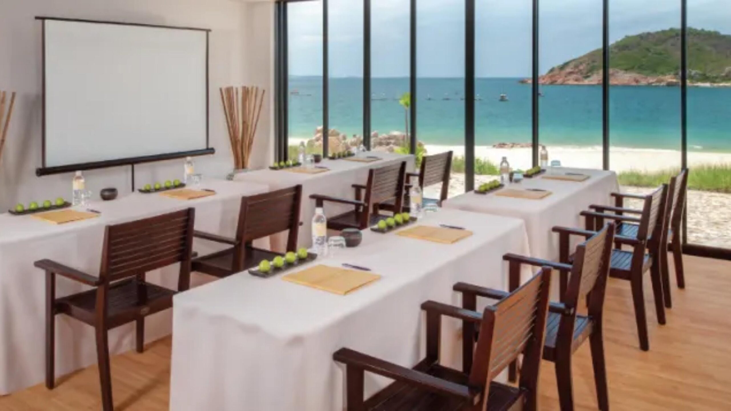 Với không gian hội nghị chan hòa ánh sáng với các cửa sổ bằng kính và hướng nhìn ra biển cùng các trang bị như máy chiếu, loa, mic cùng với các thiết bị hội nghị đầy đủ sẽ làm cho cuộc hội nghị của bạn trở lên đơn giản hơn bao giờ hết. Với các phòng họp có thể bố trí cho đa chức năng cả các cuộc họp hội đồng quản trị, họp nhóm nhỏ,… Phòng hợp được ước tính có thể sắp xếp: