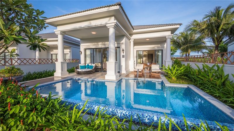 Không gian resort với hệ thống phòng nghỉ, villa 5 sao cao cấp, sạch sẽ và sang trọng lại đầy đủ tiện nghi, đồ dùng cá nhân miễn phí. Bên cạnh đó, đội ngũ nhân viên nhiệt tình luôn sẵn sàng hỗ trợ và phục vụ cực kỳ chu đáo trong suốt quá trình du khách nghỉ dưỡng tại đây.