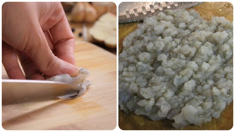 Tôm sau khi mua về, bạn cắt bỏ đuôi, bỏ đầu và lấy hết mình tôm. Sau đó rửa sạch bằng nước và lau khô. Khi tôm khô, bạn tiến hành băm nhỏ tôm.