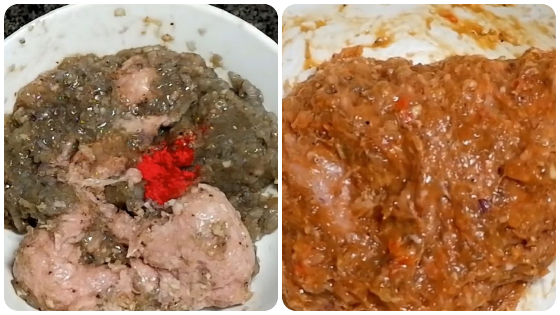 Về phần thịt xay, bạn ướp với 1 muỗng canh tỏi băm, 1 muỗng canh hành tím băm, 1 muỗng canh nước mắm, 1 muỗng cà phê đường, 1/2 muỗng cà phê tiêu và 1/4 muỗng cà phê ớt bột. Sau đó, để nghỉ khoảng 10 phút để thịt ngấm đều gia vị.