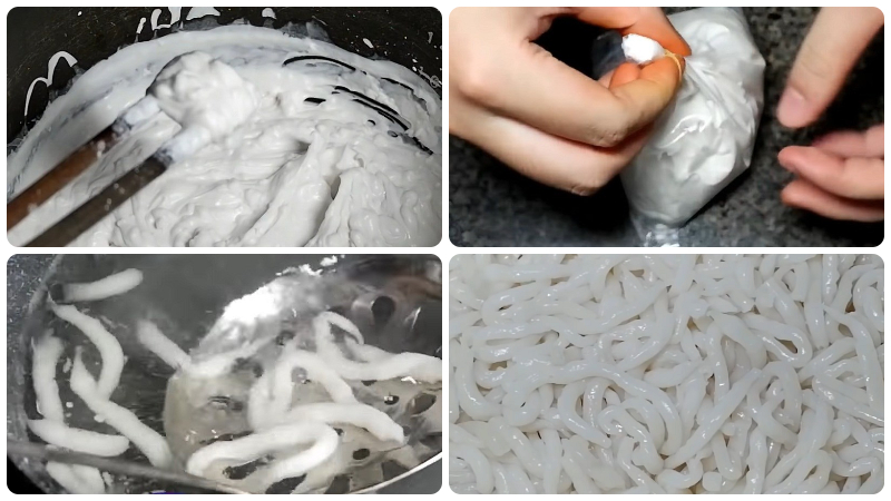 Quan trọng nhất là phải làm sao chế bột gạo để sợi bánh canh vừa mềm vừa dẻo dai. Bột gạo sẽ được hấp cách thủy cho sánh lại rồi thêm bột sắn dây vào để tạo thành hỗn hợp sau đó cho vào túi và dùng tay bóp thành sợi vào nồi nước sôi. Chờ tới khi sợi bánh chuyển sang màu trắng đục là vớt ra xả bằng nước lạnh.