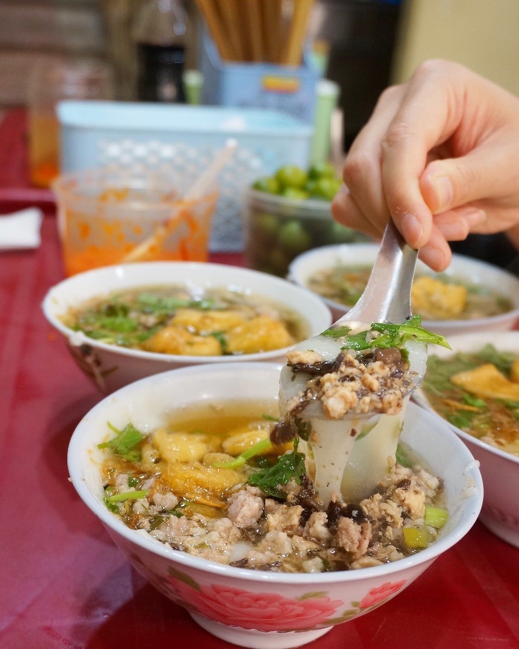 Bánh đúc được múc vào bát vừa ăn, nhân bánh đầy đặn, nước mắm thơm ngon vừa miệng, chỉ cần thêm chút ớt chưng là dậy mùi kích thích vị giác.