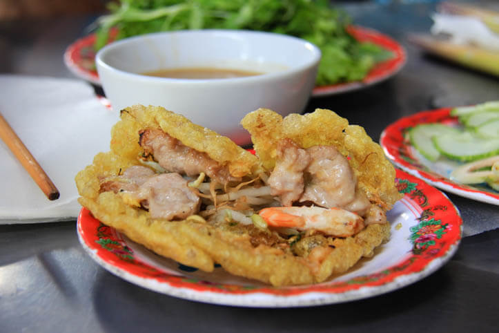 Và một trong những món ngon nhất định phải thử chính là bánh khoái Huế với lớp vỏ vàng giòn rụm cùng với nước chấm đậm đà đem lại hương vị tuyệt hảo, vừa ăn vừa ngắm nhìn khung cảnh tấp nập của chợ thì còn gì bằng đúng không các bạn ơi.