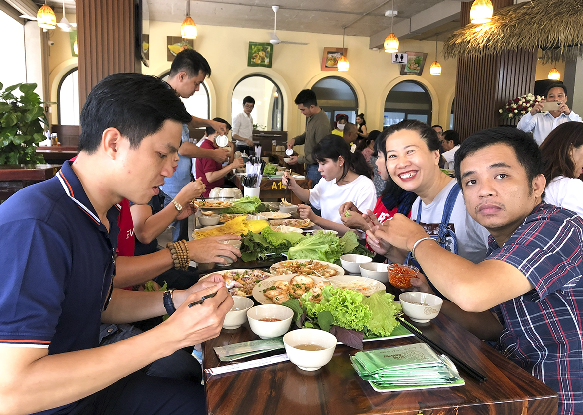 Khi thưởng thức, bạn sẽ cảm nhận được độ giòn của lớp vỏ bánh kết hợp với vị ngọt của nhân tôm thịt. Ăn kèm chút rau sống hòa quyện với nước chấm đậm đà khiến du khách không thể nào quên.