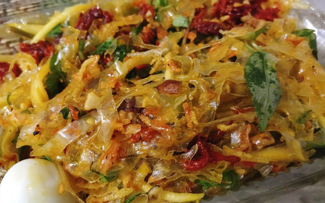 Có bánh tráng phơi sương có màu vàng đặc trưng, cùng với các nguyên liệu phụ như bò khô, tôm khô, trứng cút, xoài, rau răm, sa tế, muối tôm và một ít tắc. Nếu bạn thích ăn chua và cay thì có thể thêm chút nước me, nước tắc hoặc một ít ớt xay. Sau đó trộn đều tất cả nguyên liệu lên và bạn nên thưởng thức ngay thì sợi bánh tráng mới giữ được độ giòn.
