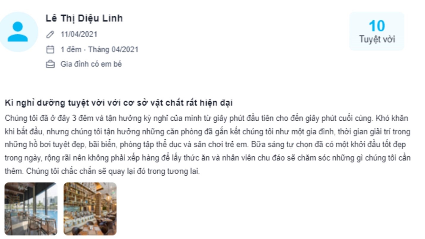 Best Western Premier Sonasea Phu Quoc không chỉ dành cho các cặp đôi mà là nơi tuyệt vời cho cả các gia đình đã có em bé, chị Diệu Linh cùng gia đình nhỏ sau khi lựa chọn nơi đây để lưu trú đã đánh giá: “Chúng tôi đã ở đây 3 đêm và tận hưởng kỳ nghỉ của mình từ giây phút đầu cho đến cuối. Khó khăn khi bắt đầu nhưng chúng tôi tận hưởng những căn phòng đã gắn kết chúng tôi như một gia đình, thời gian giải trí trong hồ bơi thật tuyệt vời, bãi biển, phòng tập, khu vui chơi cho trẻ em. Bữa sáng tự chọn cũng là một sự khởi đầu tốt đẹp cho ngày mới, phòng ăn rộng nên không cần xếp hàng khi lấy đồ ăn và nhân viên rất chu đáo luôn chú ý đến những gì tôi cần. Tôi chắc chắn sẽ quay lại đây”