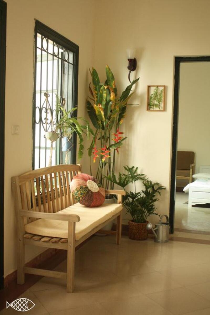 Phòng Cá thu gồm 3 giường đơn với diện tích khoảng 25m2, được trang bị đầy đủ tiện nghi từ bàn uống nước tới TV cùng ban công nhìn ra khoảng vườn nhỏ xinh của homestay. Căn phòng cũng sử dụng tone màu be nâu kết hợp với những vật dụng tre nứa làm điểm nhấn. Nhờ đó mà không gian trở nên trang nhã và tinh tế.