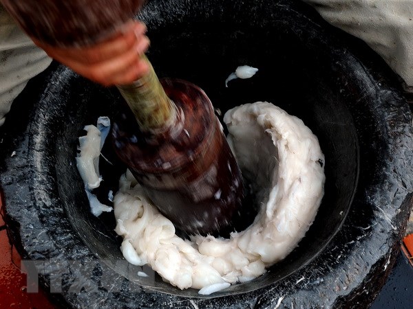 - Sau khi chờ khoảng 1 tiếng, cho nguyên liệu đủ xay vào cối, dùng chày giã nhuyễn bằng tay cho đến khi các nguyên liệu trở nên nhuyễn mềm đồng thời sệt lại vào nhau. Lưu ý, nên cho nguyên liệu vào cối với một lượng vừa phải và có thể xay nhiều lần, sau đó dùng muôi gỗ quết đều liên tục giúp cho miếng chả mực có được độ dẻo dính tốt hơn.