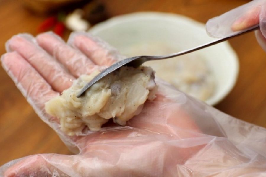 - Để quá trình tạo hình chả mực được diễn ra dễ dàng và thuận tiện nhất, thực khách hãy nên thoa một lớp dầu ăn mỏng nhẹ lên bao tay nilon hoặc lòng bàn tay. Sau đó lấy một phần hỗn hợp chả mực vừa phải, vo tròn, ấn nhẹ. Lưu ý rằng, để có được những miếng chả mực ngọt thanh, giòn tan thì ta không nên ép quá mỏng nhé!