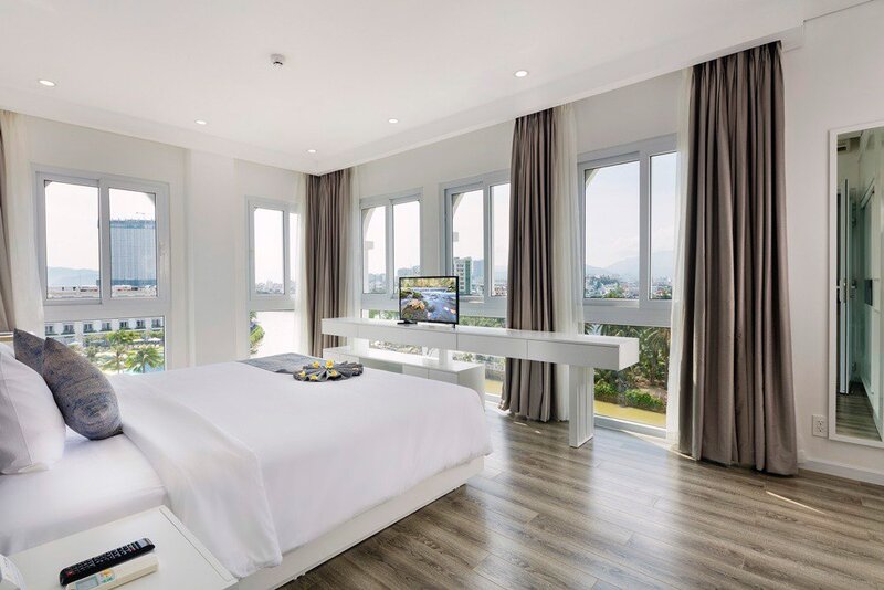 Phòng Deluxe cùng diện tích với hạng phòng Superior nhưng cao cấp hơn bởi sở hữu view nhìn tuyệt đẹp ra sông, biển. Căn phòng có thiết kế nhiều họa tiết nhưng không làm mất đi vẻ sang trọng. Từ ban công của phòng ngủ, du khách có thể ngắm nhìn dòng sông Cái, cửa biển Nha Trang và thậm chí là tháp bà Ponagar phía xa xa.