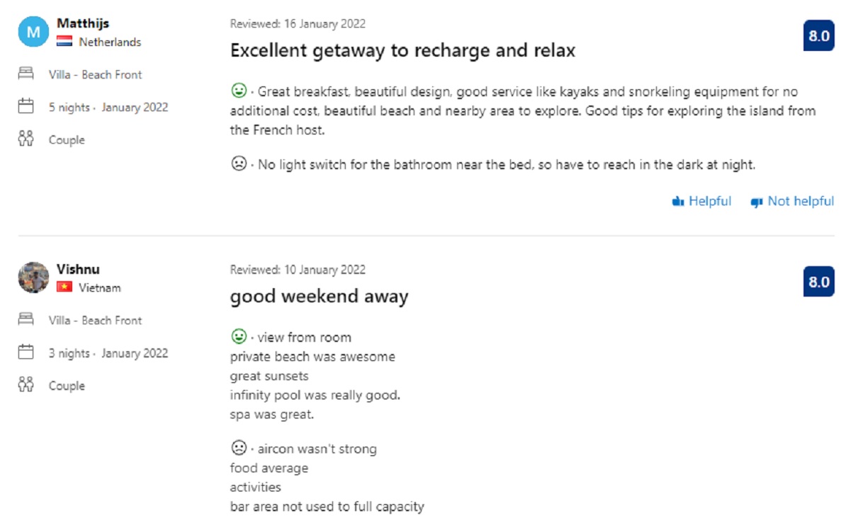 Biệt thự có bể sục cá nhân được cải tạo và xây dựng lại bên bờ biển được bao quanh bởi khu vườn nhiệt đới tươi tốt và có tầm nhìn ra góc biển từ sân hiên. Biệt thự rộng 150 mét vuông rộng rãi mang đến cảm giác sang trọng nhưng lại gần gũi bình dị. Villa có lối thiết kế bằng gỗ cứng ấm áp, sàn xi măng đánh bóng với giường nền kiểu Nhật.