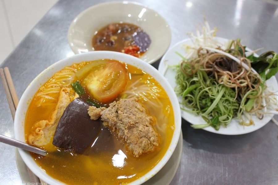 Không quá cầu kỳ trong các món ăn kèm, tô bún riêu chỉ gồm miếng riêu cua chắc thịt, huyết heo miếng, chả và đậu hũ nhưng mỗi thành phần lại tạo được điểm nhấn riêng trong hương vị.