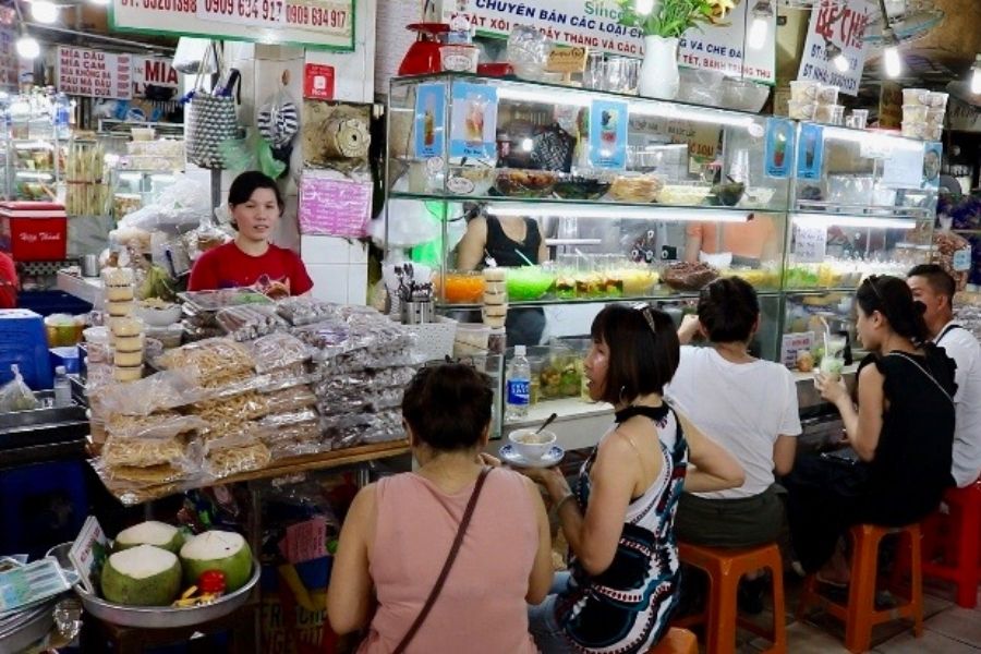 Thời tiết Sài Gòn lúc nào cũng nóng nực, khắc nghiệt, vì vậy chè là một món ăn chơi được ưa chuộng từ già tới trẻ không thể thiếu ở chợ. Quán chè nằm nép mình ở cửa số 7, hướng Tây chợ Bến Thành hấp dẫn thực khách ngay từ lần đầu. Chè trông vô cùng bắt mắt, hấp dẫn với đủ loại đủ màu sắc như: màu xanh của cốm non, màu vàng tươi của chuối chín, ngô ngọt,…