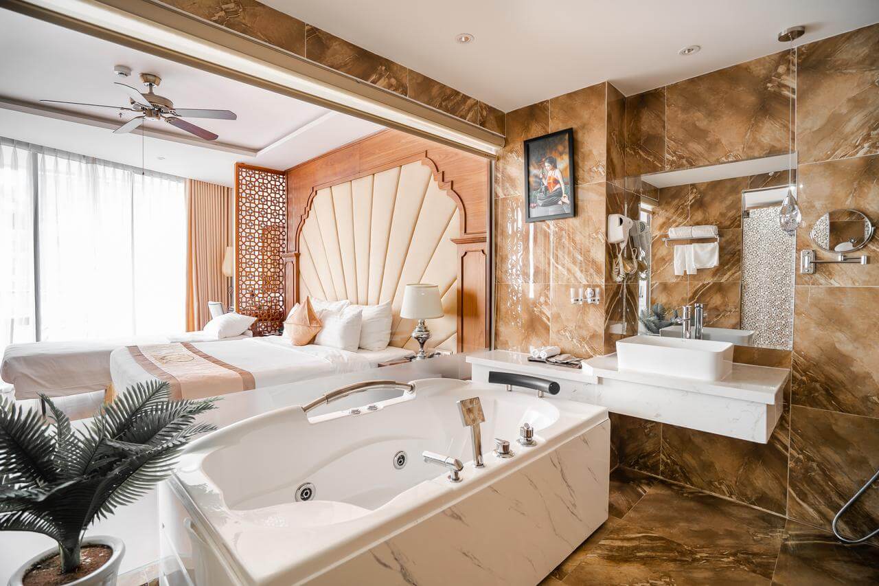 Không chỉ thế, căn phòng còn toát lên được nét đẹp sang trọng thông qua phong cách bài trí nội thất tân cổ điển đầy tinh tế, tỉ mỉ từ những họa tiết nhỏ, xứng đáng là hạng phòng đắt giá và tuyệt vời cho những kỳ nghỉ xa hoa, đầy quyền quý.