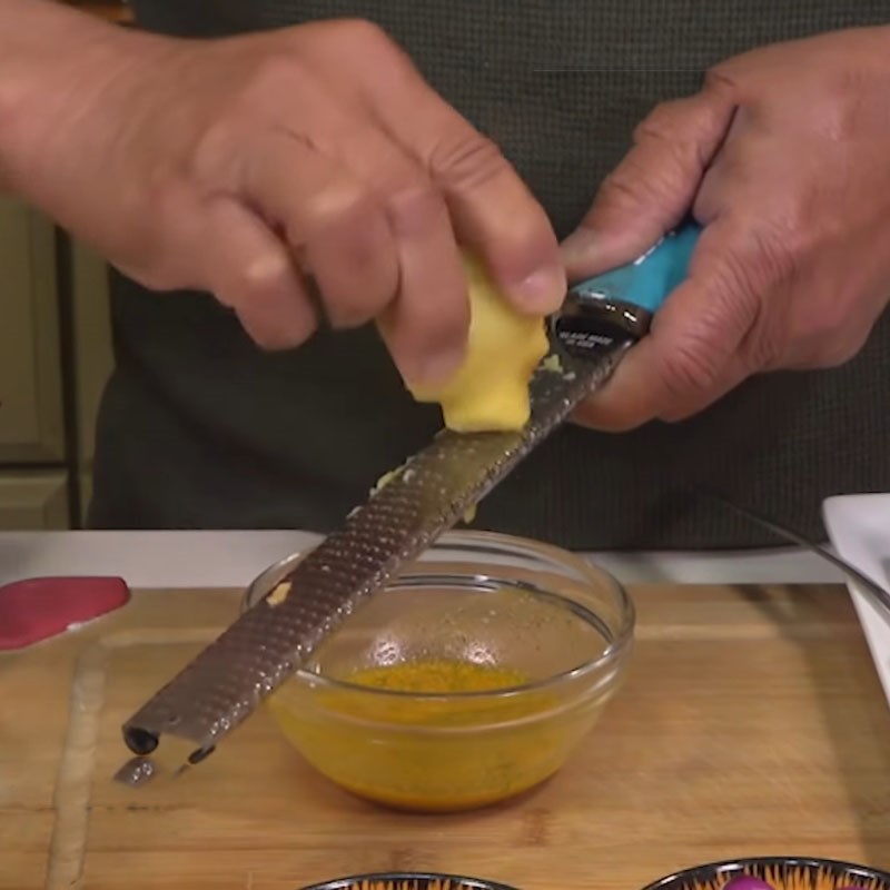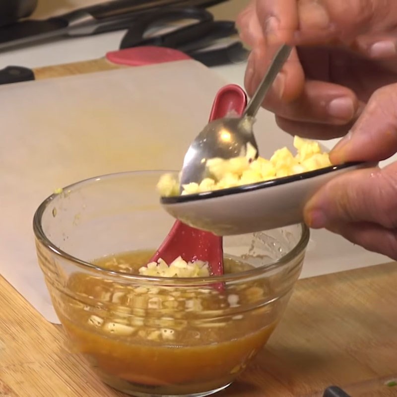 bạn cho vào chén nước sốt bao gồm 1/2 muỗng cà phê bột hành, 1/2 muỗng cà phê muối, 1/2 muỗng cà phê đường, 1/2 muỗng cà phê hạt nêm, 1/2 muỗng cà phê bột nghệ, 2 muỗng cà phê rượu trắng và 1 ít gừng băm, khuấy đều để gia vị tan hết.