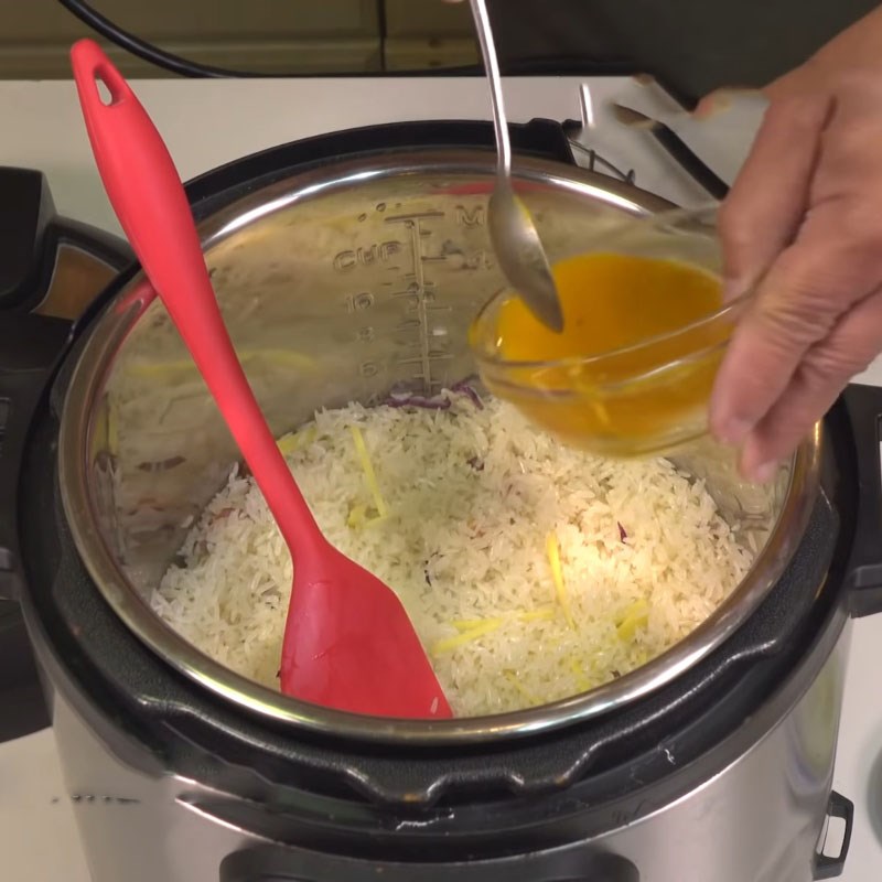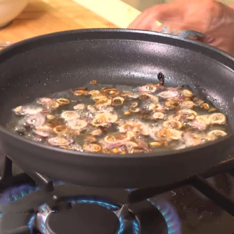 Để hoàn thành món ăn này bạn bắc chảo lên bếp cho thêm một muỗng canh dầu ăn cùng một ít mỡ gà và hành tìm vào đảo thơm hành sau đó bạn cho phần gạo ngâm vào đảo đến khi nào khô thì tắt bếp.