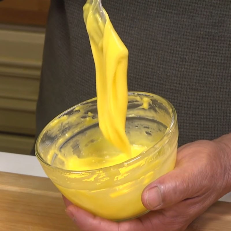 Đầu tiên bạn cần tách lấy phần lòng đỏ của trứng để vào chén sau đó để chén nước đó vafp một chén nước sôi khấy đều đến khi lòng đỏ chuyển sang màu đỏ nhat. Sau đó bạn từ từ cho ít dầu ăn vào đánh đều để dầu ăn hòa vào với hỗn hợp trừng, cứ tiếp tục như vậy đến khi hỗn hợp trứng dần sệt lại là đạt yêu cầu.