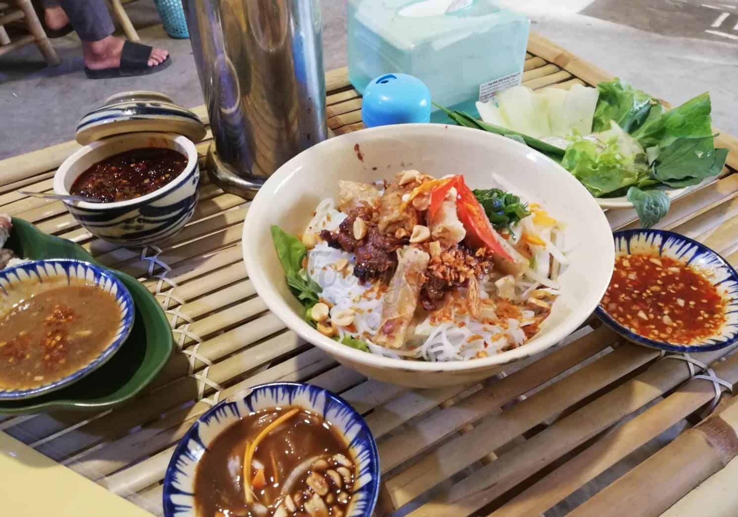Bún mắm nêm thường là món tôi nghĩ đến khi nghĩ về món ăn Việt Nam. Về cơ bản Bún mắm nêm là một món thịt lợn thái lát, được phục vụ với nhiều rau xanh và cơm nguội. Nó là đặc sản Hội An và nhất định phải thử bất cứ khi nào bạn đến đây!