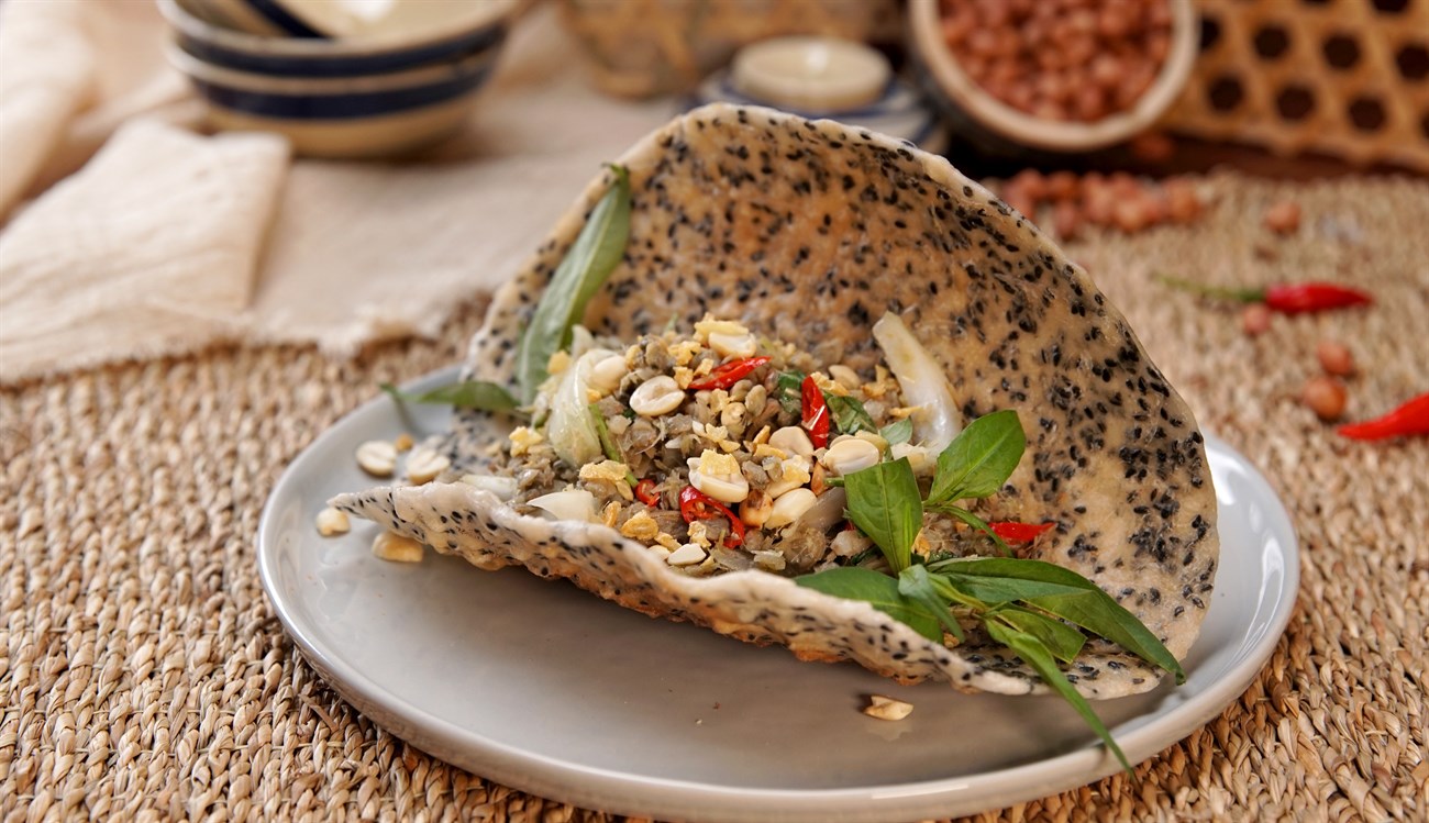 Bạn sẽ gói tất cả các loại rau ăn kèm thịt heo nướng này trong hai lớp bánh tráng, gồm một lớp bánh tráng tươi và một lớp bánh tráng khô rồi chấm vào nước chấm đặc biệt.