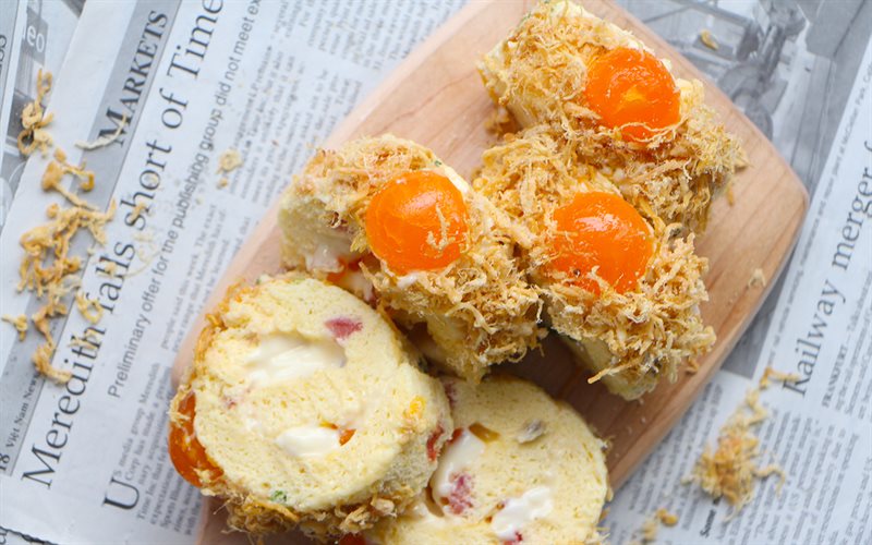 Bánh bông lan có lẽ là một món ăn quá quen thuộc với chúng ta rồi đúng không nào? Vậy hãy cùng tìm hiểu một loại bánh bông lan đặc biệt hơn nhé – chính là bánh bông lan trứng muối chà bông. Bánh bông lan sau khi cuộn lại sẽ được phủ một lớp chà bông bên ngoài, nhân bên trong là sốt phô mai chảy béo ngậy kết hợp với vị mặn của trứng muối tạo nên một món đặc sản Sài Gòn cực kỳ hấp dẫn.