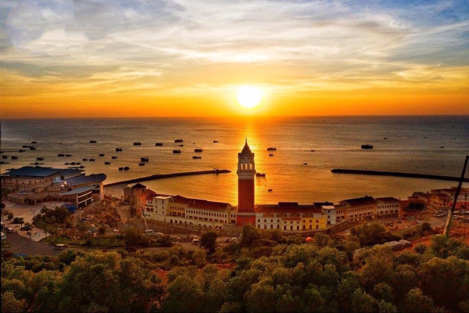 Tháp đồng hồ nổi bật với chiều cao 75m ngay trung tâm thị trấn Địa Trung Hải Phú Quốc. Được xây dựng theo hình ảnh tháp chuông Campanile của thánh Mark – biểu tượng của nước Ý, công trình này nhanh chóng nhận được sự quan tâm của nhiều du khách, bởi sự thiết kế của tháp đồng hồ được coi là rất chuyên nghiệp.