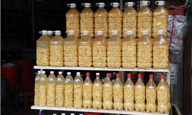 Loại rượu này nghe tên đã biết được công dụng của nó rồi, rượu được ngâm từ những con sâu chít ở trên cây, có hình dáng giống như con tằm Du lịch tam đảo bạn có thể mang về để biếu cho mấy anh, đảm bảo sẽ khoái vì công dụng chính của nó là bổ thận, tráng dương.