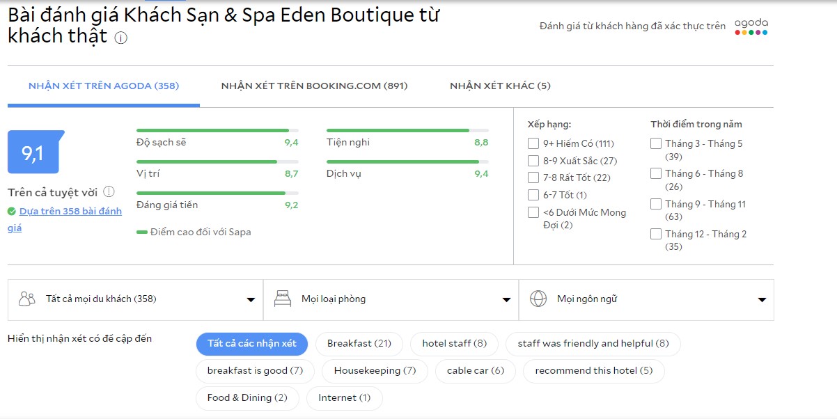 Review của khách hàng về Khách sạn Eden Boutique Hotel Sapa