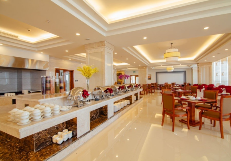 Nhà hàng nằm trên tầng 8, khi dùng đồ ăn tại đây thực khách sẽ được ngắm được cảnh vật từ trên cao xuống, toàn khung cảnh lên thơ, hấp dẫn. Bạn có thể dùng bữa sáng hoặc bữa tối ở nhà hàng đều được nhất là khi bình minh hay hoàng hôn ló rạng. Bạn sẽ ngắm được tận cảnh bầu trời trong xanh với mặt trời đỏ rực lao xuống – nhô lên. Món ăn tại đây thì đều là các món ăn địa phương, món Âu. Thưởng thức chung với ly rượu vang thì hết sức tuyệt vời. Bên cạnh đó, Nhà hàng Sunrise còn có Phòng Vip phục vụ tối đa 20 khách, phù hợp với những khách muốn có sự riêng tư cho gia đình, nhóm bạn.