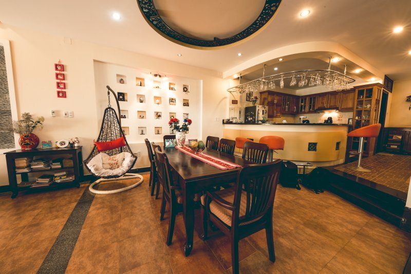 Phòng bếp của Hillside Homestay Hue rất rộng rãi đủ để bố trí thêm một quầy bar nhỏ và đặt một bộ bàn ăn gỗ cho 10 người dùng bữa. Bếp sẽ được chuẩn bị sẵn tủ lạnh, bếp, ấm siêu tốc,… Điều đặc biệt khiến người ta chú ý vào căn bếp chính là các đồ trang trí nhỏ nhỏ, dễ thương được sắp xếp vào từng ô trên tường. Nom thật đẹp mắt. Phòng bếp kết hợp phòng ăn sẽ là nơi diễn ra bữa lẩu, nướng tùy ý của bạn và gia đình, bạn bè. Mọi người có thể cùng nhau nấu ăn, quây quần, tám một vài câu chuyện rồi “chill chill” hưởng thụ với ly rượu ngoại ở quầy bar.