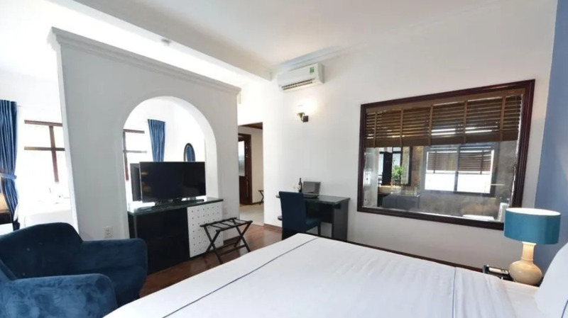 Căn phòng rộng 26m2 với lối bài trí hướng đến sự đơn giản và vẫn đầy đủ đồ dùng cần thiết cho du khách. Chiếc cửa lớn đưa ánh sáng tự nhiên vào trong phòng làm căn phòng trở lên thoáng đãng hơn. Đồ nội thất được sắp xếp gọn gàng với gam màu nâu trầm kết hợp ánh đèn vàng lung linh đem đến cho du khách cảm giác ấm cúng như ở nhà vậy.