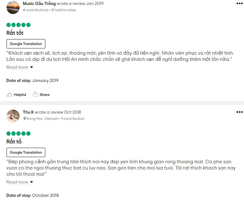 Sở hữu vị trí đẹp, cảnh quan thiên nhiên tuyệt vời cùng vẻ đẹp của 1 Hội An xưa cũ. Không lạ gì khi hàng năm, Hoi An Historic Hotel đã và đang đón hàng ngàn lượt khách đến đây nghỉ dưỡng. Dưới đây là những đánh giá chân thực của những vị khách sau khi đặt trên tới khách sạn. Bạn đọc có thể tham khảo: