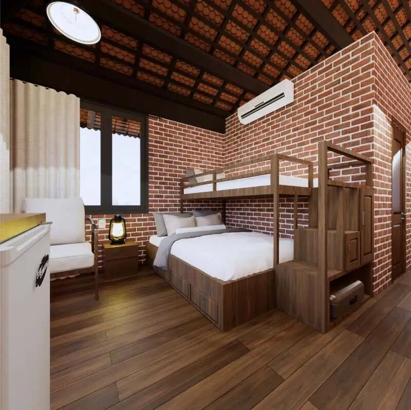 Hạng phòng này của Hương Xưa Homestay Huế sở hữu diện tích rộng 45m2 với thiết kế gồm 2 giường tầng, thích hợp dành cho các nhóm bạn 6 người. Nội thất và không gian phòng được thiết kế khá hài hòa, hợp mắt, thể hiện được sự tinh tế, sang trọng đến từng chi tiết. Do vậy, nếu có cơ hội nghỉ ngơi, lưu trú tại homestay này, đừng ngần ngại mà bỏ qua Dorm Six nhé!
