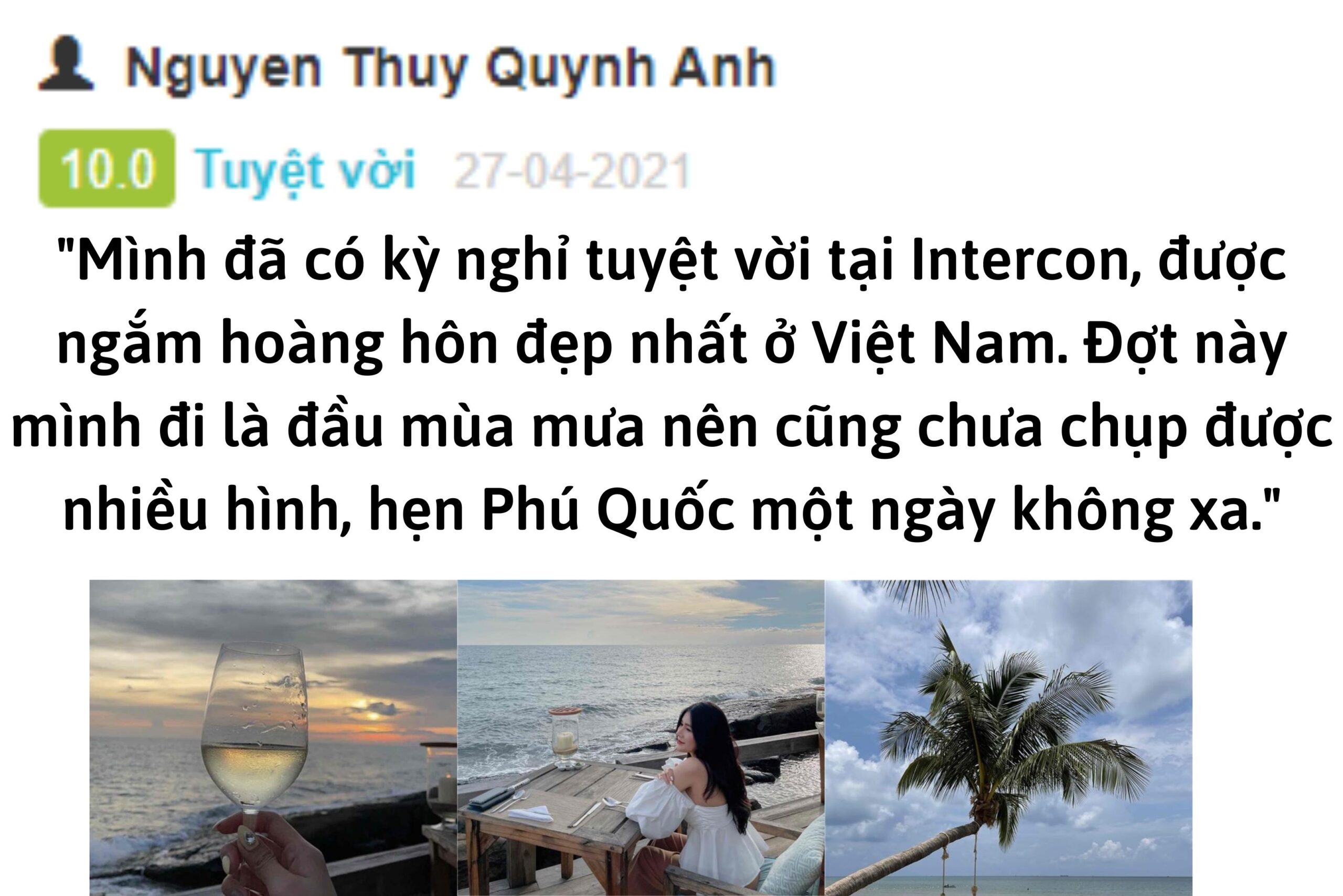 Chị Nguyen Thuy Quynh Anh đac có trải nghiệm tuyệt vời tại dây chia sẻ: “Mình đã có kỳ nghỉ tuyệt vời tại Intercon, được ngắm hoàng hôn đẹp nhất ở Việt Nam. Đợt này mình đi là đầu mùa mưa nên cũng chưa chụp được nhiều hình, hẹn Phú Quốc một ngày không xa.”