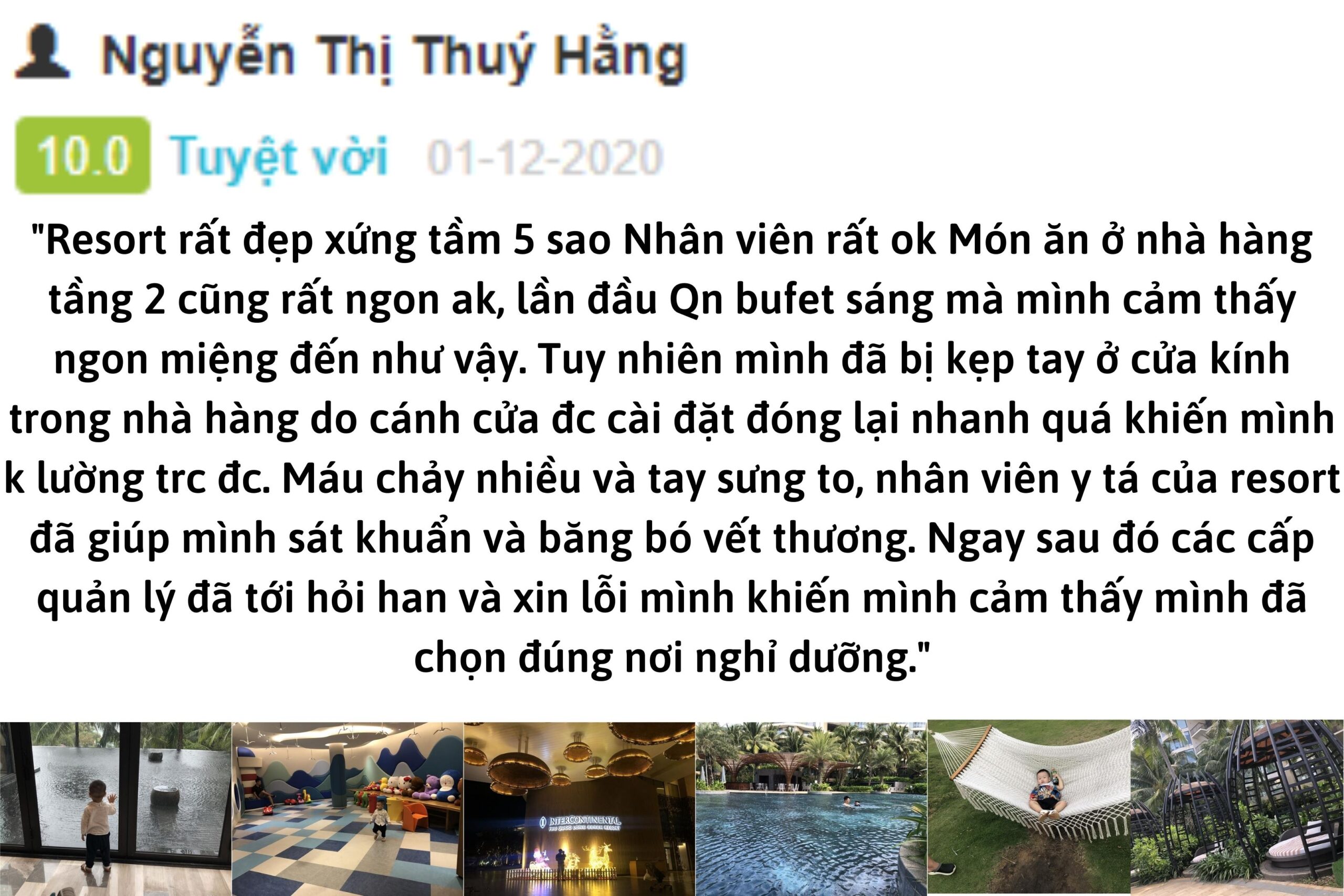 Bạn Nguyễn Thị Thúy Hằng cũng hài lòng chia sẻ: “Resort rất đẹp xứng tầm 5 sao Nhân viên rất ok Món ăn ở nhà hàng tầng 2 cũng rất ngon ak, lần đầu Qn buffet sáng mà mình cảm thấy ngon miệng đến như vậy. Tuy nhiên mình đã bị kẹp tay ở cửa kính trong nhà hàng do cánh cửa đc cài đặt đóng lại nhanh quá khiến mình k lường trước đc. Máu chảy nhiều và tay sưng to, nhân viên y tá của resort đã giúp mình sát khuẩn và băng bó vết thương. Ngay sau đó các cấp quản lý đã tới hỏi han và xin lỗi mình khiến mình cảm thấy mình đã chọn đúng nơi nghỉ dưỡng.”