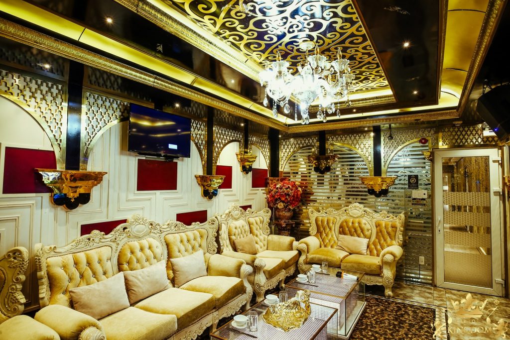 Quán Karaoke Kingdom quận 1 theo phong cách hoàng gia cùng với không gian sang trọng, lung linh, trang trí hiện đại. Phòng karaoke của quán được trang trí đẹp, rộng và thoáng mát sạch sẽ, trang  trí nhiều kiểu khác nhau, lấy chủ đề của nhiều nước trên thế giới. Cùng với dàn âm loa tân tiện hiện đại nghe cực đã tai không bị rè và vang quá, âm thanh, ánh sáng cực chất