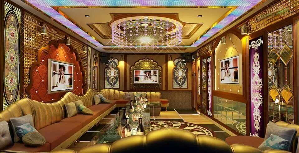 Bộ bàn ghế sofa ở đây có hình vòng cung hay những chiếc ghế dài màu sắc hoa văn tao nhã được kết hợp cùng với màu tường, trần và vật dụng trang trí rất hài hòa. Quán có các  dàn âm thanh khủng, cùng với màn hình rộng gồm nhiều danh sách bài hát thuộc nhiều thể loại khác nhau được cập nhật liên tục.