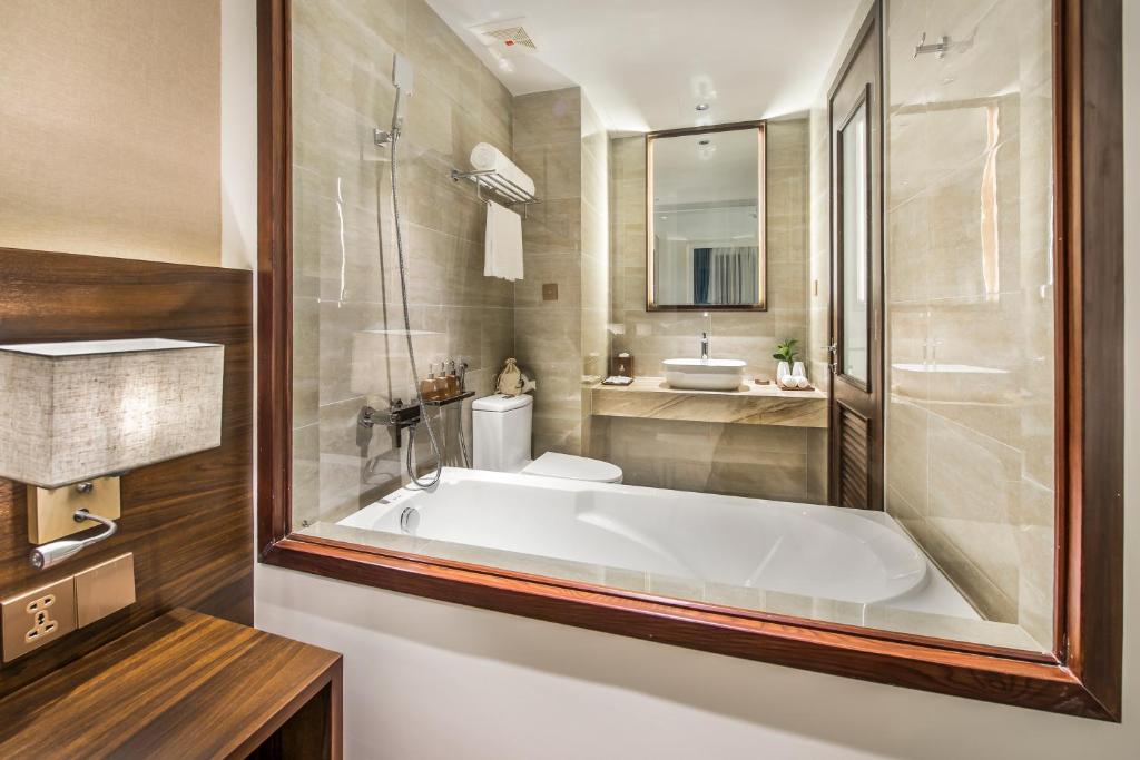 Phòng tắm luôn được chuẩn bị đầy đủ đồ dùng cá nhân như khăn tắm, áo choàng tắm…, mỗi sáng sẽ có nhân viên đến đổi mới cho từng phòng, đảm bảo du khách luôn được hưởng thụ những yếu tố nghỉ dưỡng chất lượng nhất. Bồn tắm hiện đại sẽ là chốn riêng tư cho bạn đắm mình vào làn nước mát, thưởng thức những phút giây nghỉ dưỡng hoàn hảo nhất.
