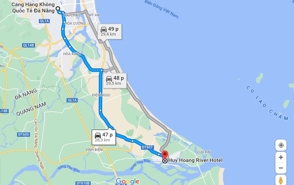 Cụ thể, từ Sân bay Đà Nẵng, bạn cần đi theo đường Duy Tân đến Nguyễn Hữu Thọ tại Hòa Thuận Tây. Tiếp theo, đi dọc theo Nguyễn Hữu Thọ, Võ Chí Công và ĐT607 đến Ngô Gia Tự tại Sơn Phong, Thành phố Hội An. Cuối cùng, bạn chỉ cần đi dọc theo Ngô Gia Tự và Hoàng Diệu đến Đường Phan Bội Châu tại Cẩm Châu. Bạn có thể ngồi xe khách đến thành phố Hội An rồi đi xe taxi đến khách sạn hoặc thuê xe limousine đến tận nơi để việc di chuyển thuận tiện hơn.