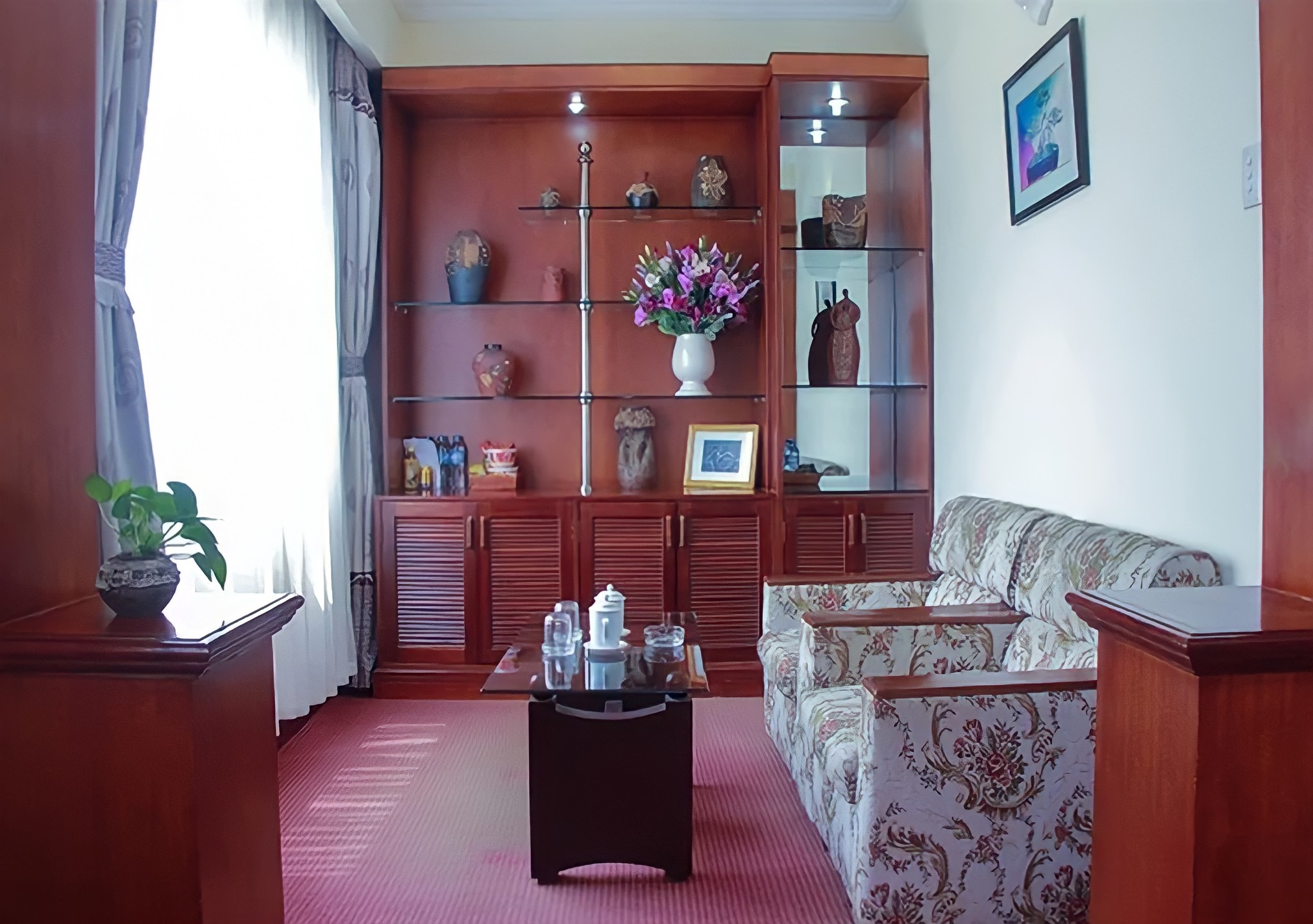 Tiếp đến là một hạng phòng có diện tích vô cùng rộng rãi, lên đến 47m2. Đây là hạng phòng vip của khách sạn Kim Liên Hà Nội với sức chứa đủ cho 4 người lớn. Nội thất trong phòng VIP chủ yếu được làm từ chất liệu gỗ, có chạm khắc họa tiết nên khá sang trọng và tạo được sự gần gũi với du khách. Ngoài ra, phòng còn được thiết kế thêm một khu vực tiếp khách nhỏ có bàn ghế sofa và bộ ấm chén. Tất nhiên, hạng phòng này cũng được chuẩn bị sẵn các đồ dùng cơ bản và tận 2 giường đôi nên mọi người không phải lo thiếu thốn bất cứ thứ gì nhé. Và giống như những hạng phòng trước, phòng VIP cũng có tầm nhìn hướng ra thành phố nhưng bao quát hơn và ít bị giới hạn tầm nhìn hơn.