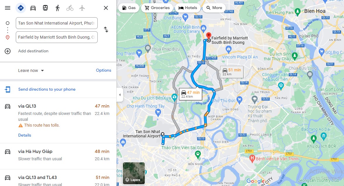 Du khách khi muốn nghỉ tại Khách sạn Marriott Bình Dương có thể lựa chọn nhiều cách để di chuyển tới đây. Với các du khách ở khu vực miền Nam, việc bắt các chuyến xe limousine êm ái hoặc tự lái xe đến đây là cực kỳ dễ dàng. Nhưng với các du khách từ khu vực khác, hãy lựa chọn các chuyến bay nội địa để di chuyển tới sân bay Tân Sơn Nhất. Sau đó, du khách có thể chọn dịch vụ đưa đón của khách sạn hoặc tự lái xe theo tuyến QL13 để tối ưu quãng đường của mình đến với Fairfield by Marriot South Binh Duong.