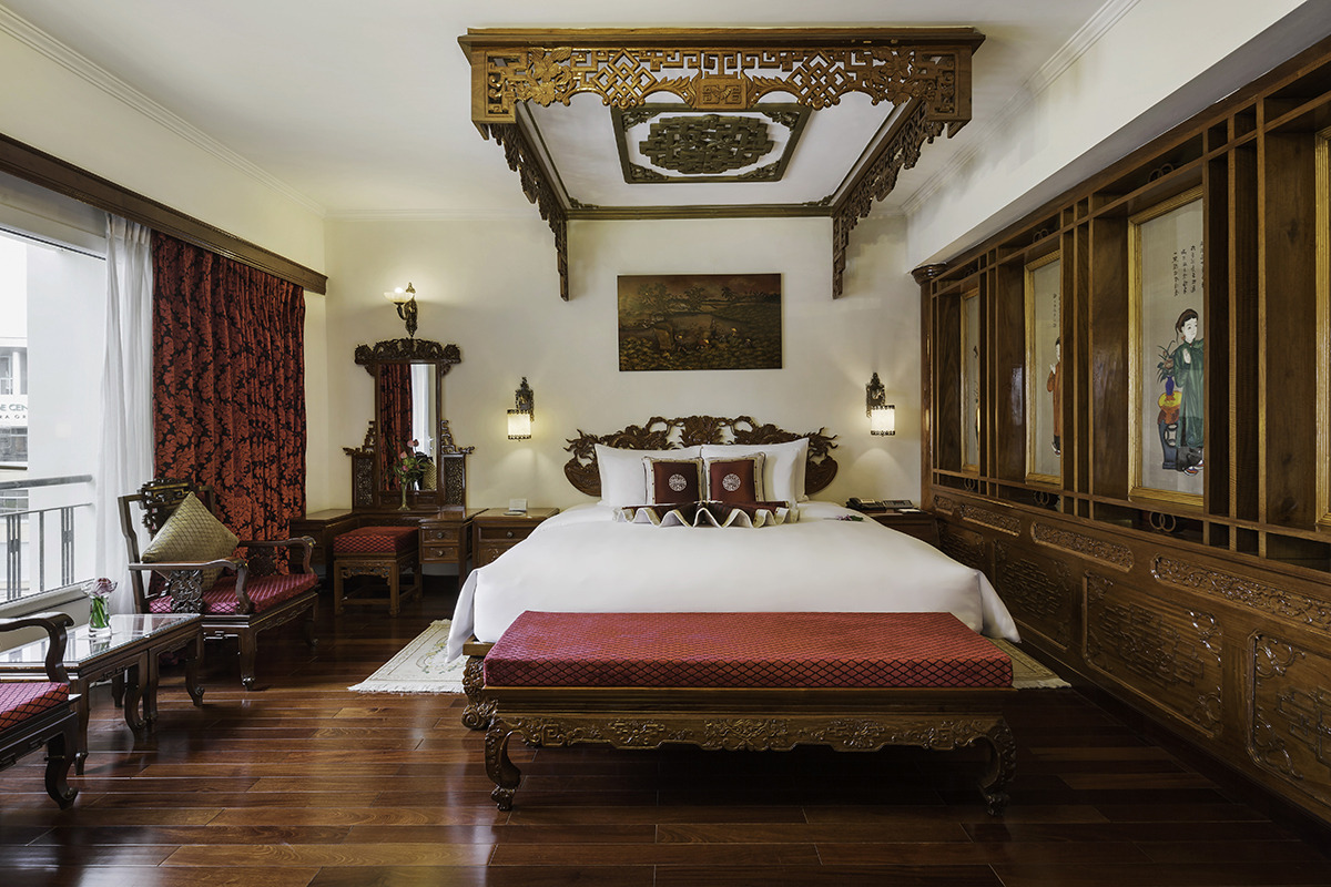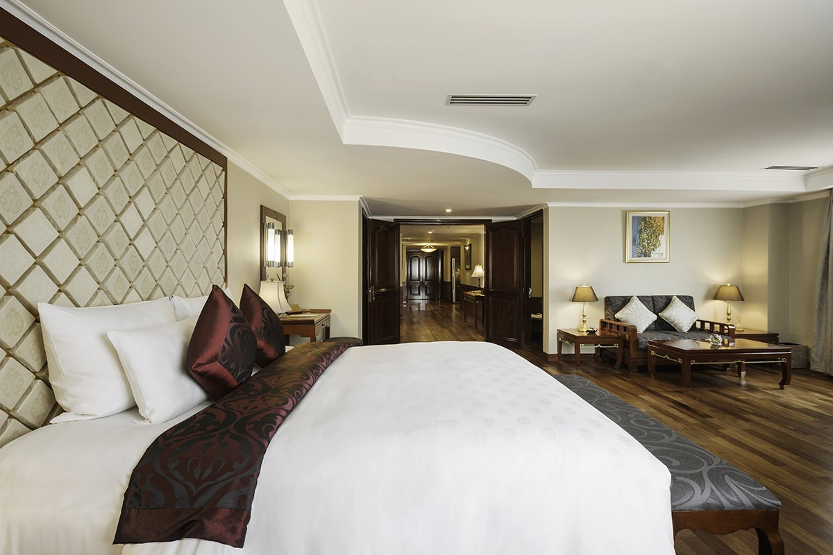 Hạng phòng Imperial Suite nằm ở tầng 3 và 4 của khu biệt thự phía Tây khách sạn, mang đậm phong cách hoàng gia thời xưa. Từ các chi tiết nhỏ như vách ngăn đến những bức tranh dân gian truyền thống đều khắc họa rõ nét phong cách cổ xưa của nơi đây. Với diện tích lên đến 98 mét vuông, căn phòng được ví như một ngôi biệt thự thu nhỏ với đầy đủ các gian nhà được tách riêng biệt từ phòng ngủ đến phòng khách và phòng ăn.