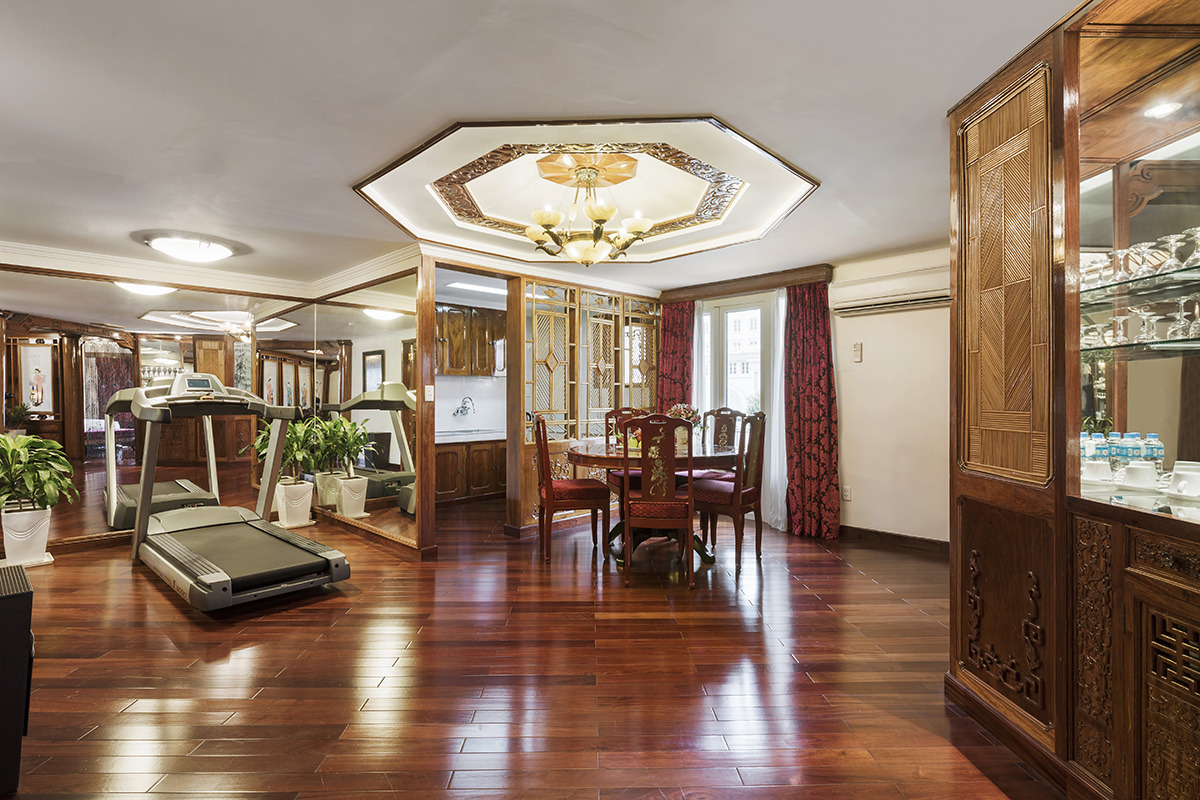 Khu vực phòng khách được trang bị thêm máy tập gym và một chiếc gương lớn phục vụ cho nhu cầu tập thể dục nâng cao sức khỏe của du khách. Bên cạnh khu vực bàn uống nước còn có tủ gỗ riêng để đựng ly rượu vang và ấm chén pha trà. Nối liền với phòng khách là khu vực bếp và bàn ăn gia đình, đây là nơi du khách có thể dành ra những khoảng thời gian đầm ấm và hạnh phúc bên những người thân yêu nhất của mình.