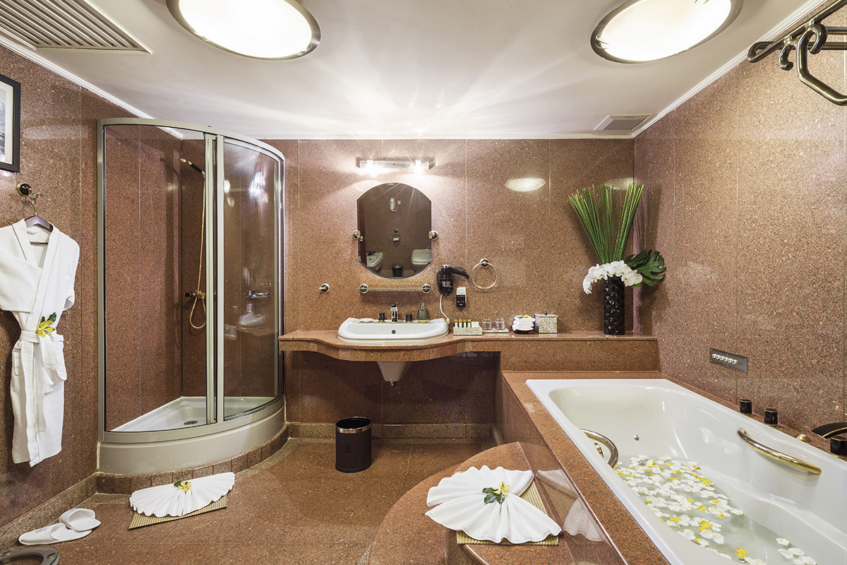 Phòng tắm của hạng Premium cũng cực kỳ đáng chú ý với không gian rộng rãi và phong cách bài trí sang trọng. Nơi đây có một bồn tắm lớn và một khu vực phòng tắm vòi sen riêng biệt để du khách tùy ý lựa chọn theo sở thích của mình. Với ánh đèn vàng lung linh huyền ảo, hy vọng rằng du khách sẽ có những trải nghiệm thật thư thái và thoải mái tại căn phòng hạng Premium.