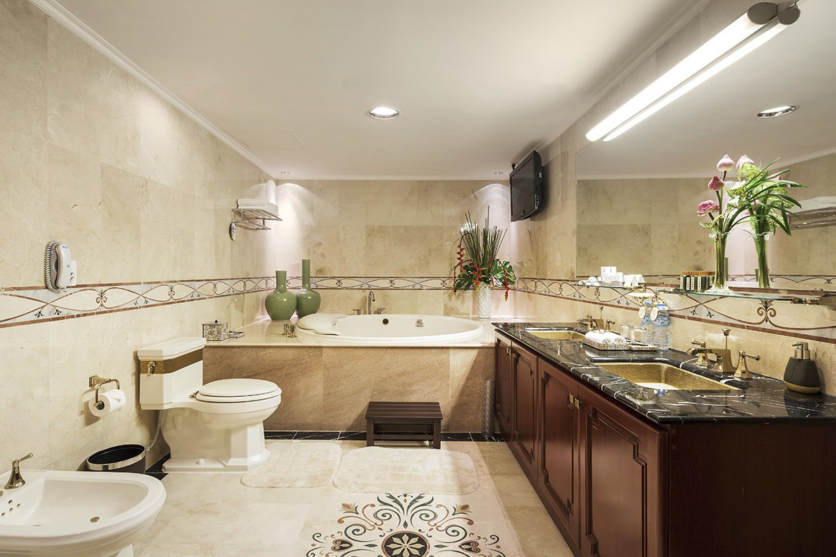 Bên cạnh đó là khu vực phòng tắm với bồn rửa mặt và vòi nước được dát một lớp vàng móng, tạo nên cảm giác đẳng cấp xa xỉ mà hiếm căn phòng nào có được. Điểm đặc biệt nhất của khu vực phòng tắm nằm ở bể sục jacuzzi, đây là nơi du khách có thể dành cho mình những giây phút thư thái và thoải mái nhất trong thời gian nghỉ dưỡng tại khách sạn.