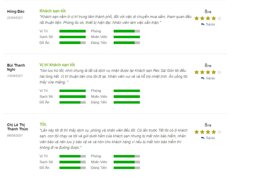 Nếu du khách thân yêu còn băn khoăn về chất lượng thật sự của khách sạn Rex thì hãy cùng Reviewvilla.vn tham khảo những đánh giá và feedback dưới đây của khách hàng đã trải nghiệm dịch vụ tại khách sạn nhé! Có thể thấy rằng khách sạn đã nhận được những đánh giá vô cùng tích cực, đủ để thấy được rằng khách hàng đã có những trải nghiệm tuyệt vời tại khách sạn. Du khách thân yêu của  Reviewvilla.vn hãy tự mình đọc và cảm nhận về những đánh giá dưới đây nhé!